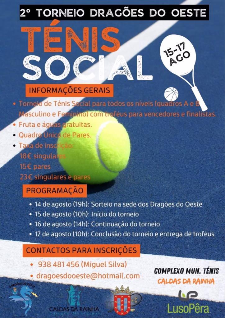 O Complexo Municipal de Ténis de Caldas da Rainha será palco, de 15 a 17 de agosto, do 2.º Torneio Dragões do Oeste de Ténis Social.